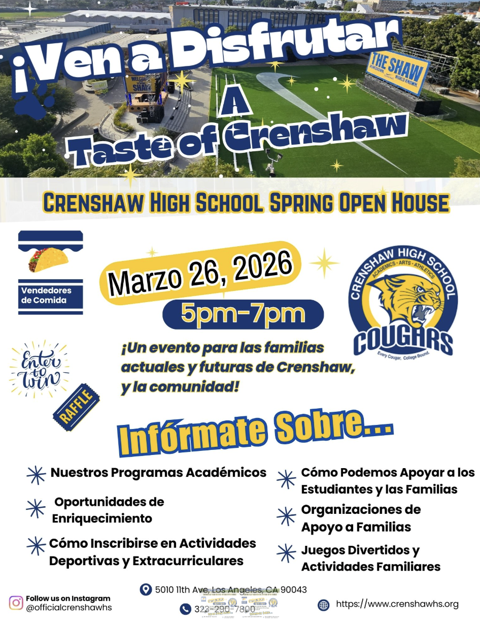 Taste of Crenshaw is a celebratory open house event designed to showcase the rich legacy and vibrant culture of Crenshaw High School through academics, athletics, and the arts. This family-friendly evening will bring together current students, alumni, feeder school families, community partners, and local supporters for an immersive experience of all that Crenshaw has to offer.