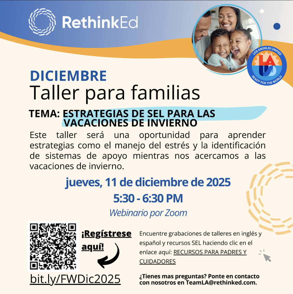 RethinkEd December Family Workshop This workshop will provide an opportunity to learn strategies such as stress management and identifying support systems as we head into Winter Break. Este taller será una oportunidad para aprender estrategias como el manejo del estrés y la identificación de sistemas de apoyo mientras nos acercamos a las vacaciones de invierno.